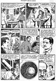 Fawcett Publications had a couple of short-lived lines of movie adaptations, including Fawcett Movie Comic. The issues were mostly comic book versions of Western movies, but #15 in 1952 was science fiction, “The Man from Planet X.” I remember the movie, but I saw it a long time ago. Based on memory, this adaptation seems fairly faithful.