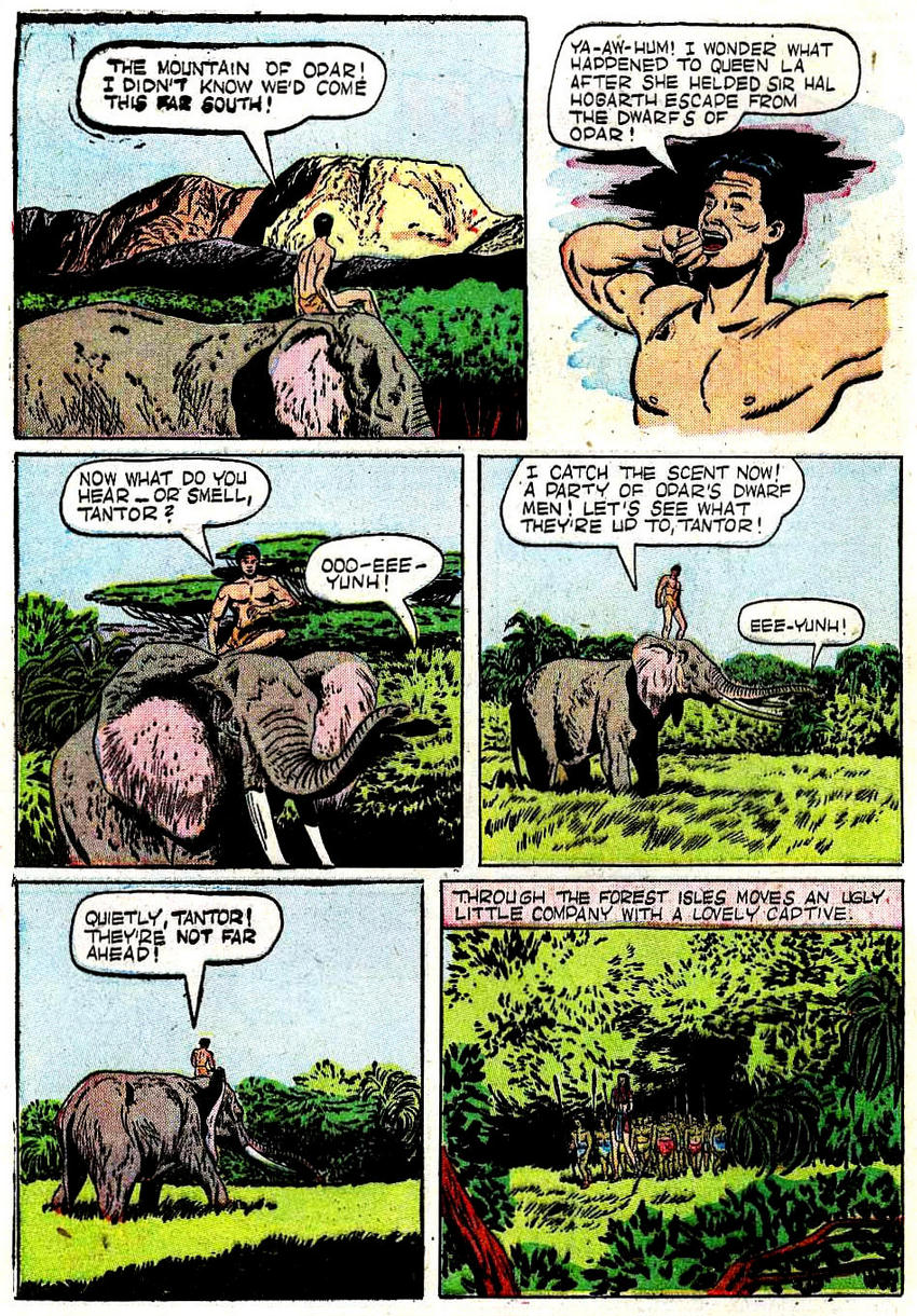 I’ve bored you mentioned before that the Tarzan comics (and novels, also, as I recall from reading them nearly 50 years ago) were about a never-ending string of lost cities, civilizations, prehistoric beasts and people, all within the African continent. Lost world stories were very popular when Edgar Rice Burroughs began writing his novels, but even in ERB’s lifetime the airplane and exploration had made such lost world stories improbable and impossible. It didn’t stop Tarzan comic book writer, Gaylord DuBois, from writing about them for years. Jesse Marsh, who also toiled for years in the comic book jungle, did the artwork on “The Cave Men,” from Tarzan #15 (1950).